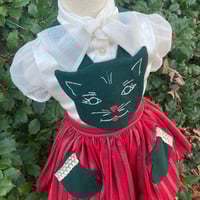 Kitty Face pinafore made with vintage holiday fabrics and trims. Bib features machine embroidered details and skirt has functional mitten shaped pockets. Skirt is lined and zips in back, straps snap at waist.
